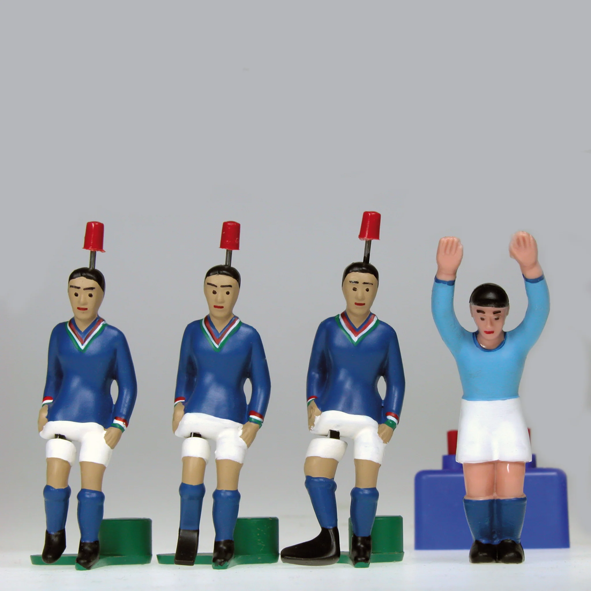Made in Germany. The set includes three hand-painted die-cast footballers and a plastic goalkeeperall painted in classic colours of World Cup winning teams.